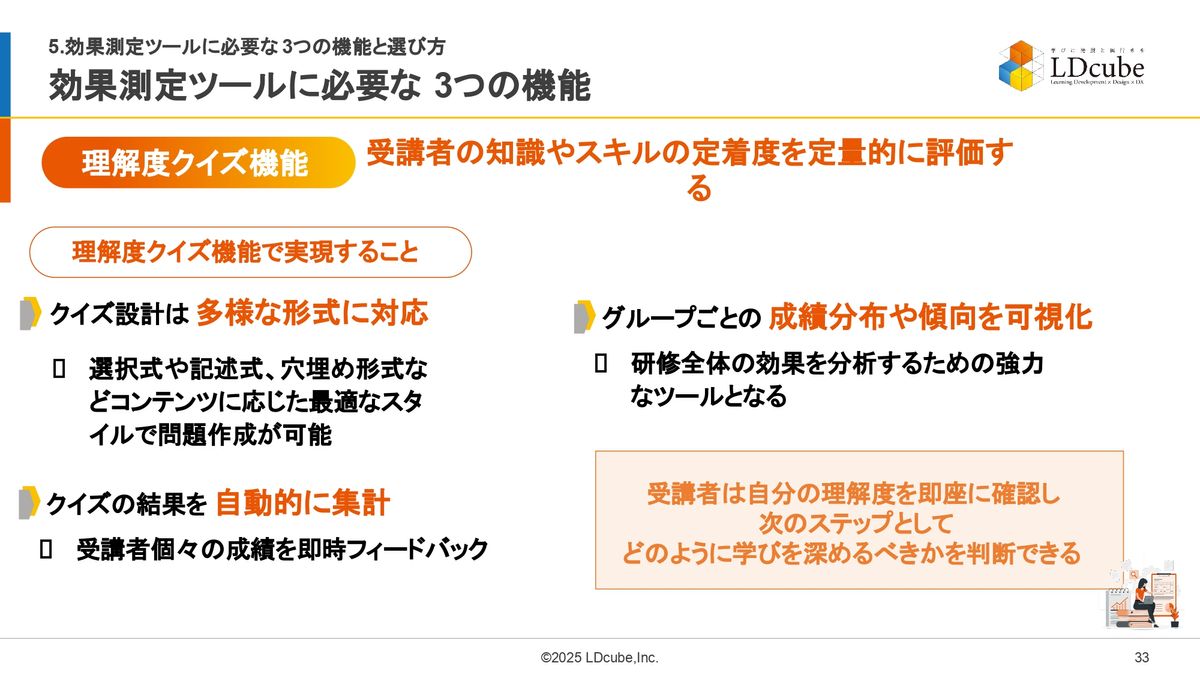 そして2つ目は、理解度クイズ機能があるものです。これも先ほどお伝えしたとおり、知識やスキルの定着度を定量的に評価するということで、(それを)実現するためには、多様な形式。クイズもただの4択問題だけではなくて、記述式や穴埋め問題など、そこに適用したような最適なスタイルで提供できるもの。