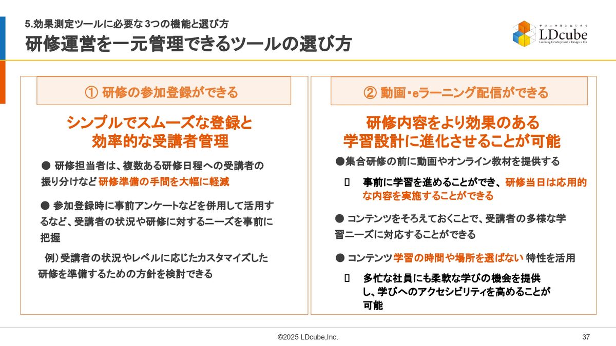 先ほど3つの機能は最低限とお伝えしましたが、研修の効果自体を上げていただくためには、欲を言えば研修の運営業務、研修運営全般を一元管理できるような、教育のためのプラットフォームみたいなものをぜひ選んでいただければと思います。