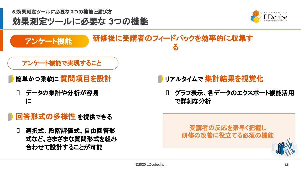 まずアンケート機能というのは、先ほどから何度もお伝えしていますが、研修後に受講生、受講者のフィードバックを効率的に収集するためのものです。なので、アンケート機能は、簡単かつ柔軟に質問項目を設計できるものにしてください。