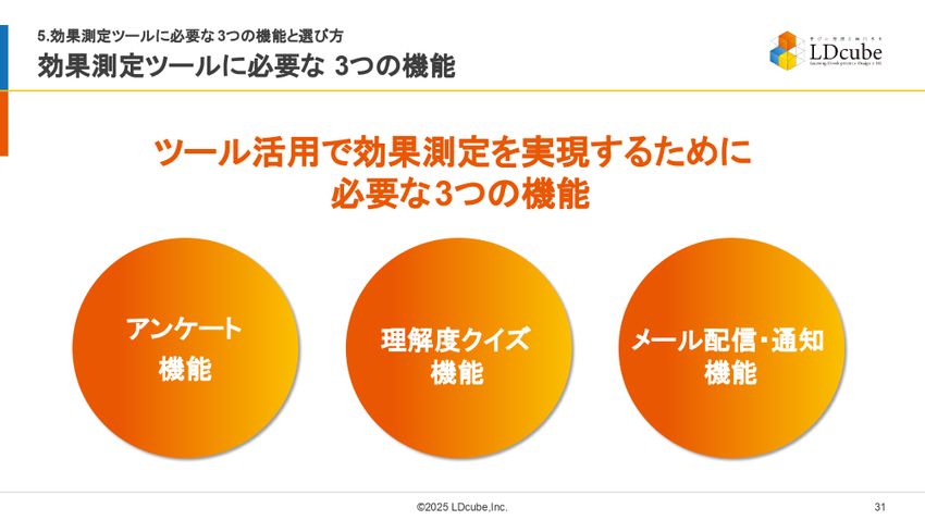 ツール活用で効果測定を実現するために必要な機能は、アンケート機能と、理解度クイズ機能と、メール配信・通知機能がある。最低限、この3つがあるものを選んでいただければと思います。