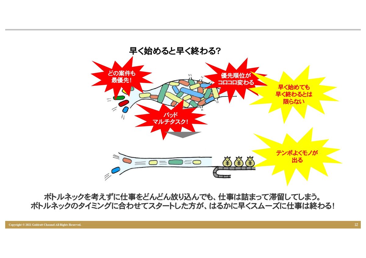 実はこのアドバイスはどこから来たかというと、「早く始めると早く終わる?」というところから来ています。どんどんぶち込んでいって、どの案件も最優先で優先順位がコロコロ変わってバッドマルチタスクになったら、早く始めても早く終わるとは限らないでしょう。