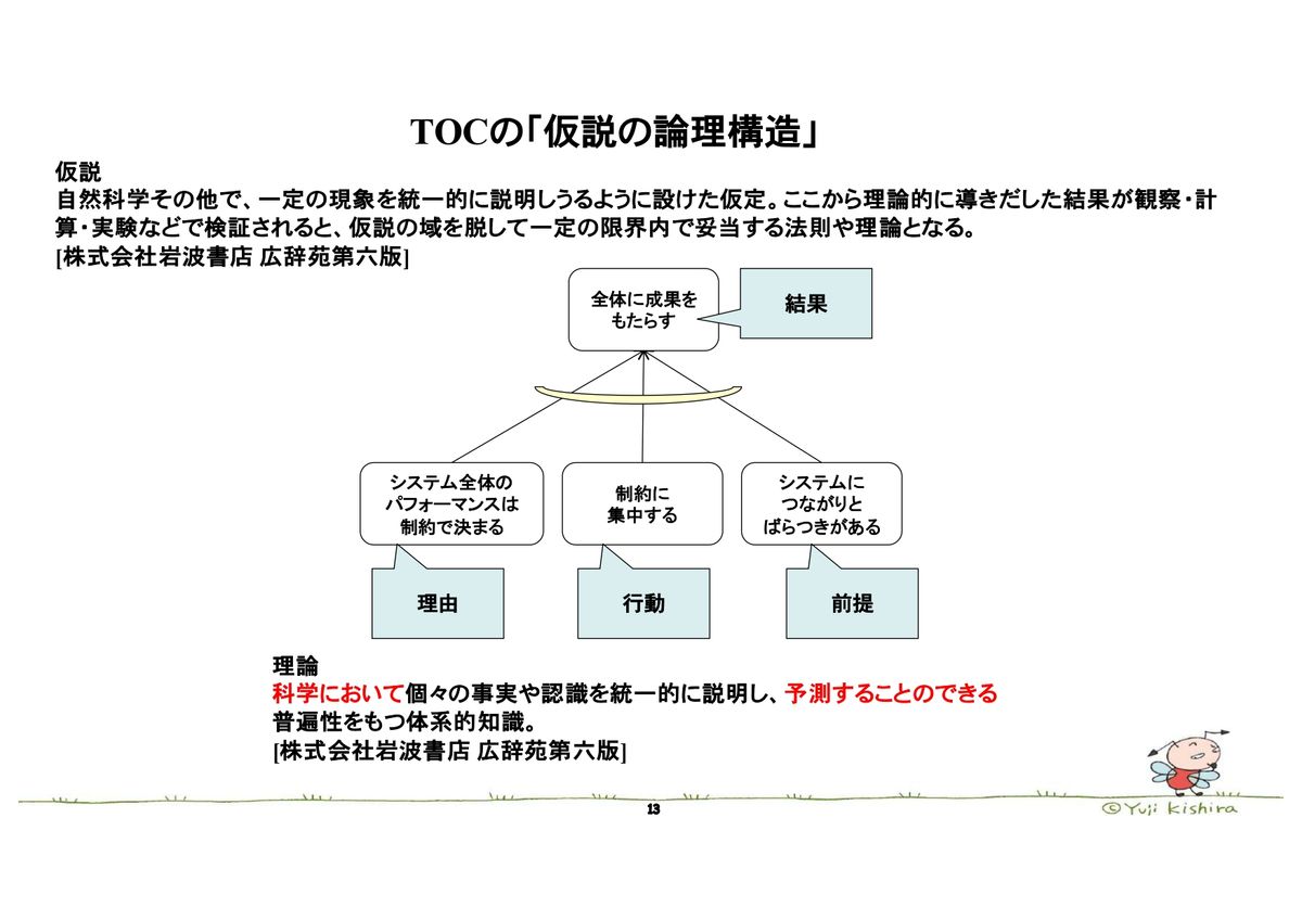 岸良:TOCって、実はこういう理論からできているんです。仮説という言葉があります。(スライドを示して)「自然科学その他で、一定の現象を統一的に説明し得るように設けた過程。ここから理論的に導き出した結果が観察・計算・実験などで検証されると、仮説の域を脱して一定の限界内で妥当する法則や理論となる」と書いていますね。