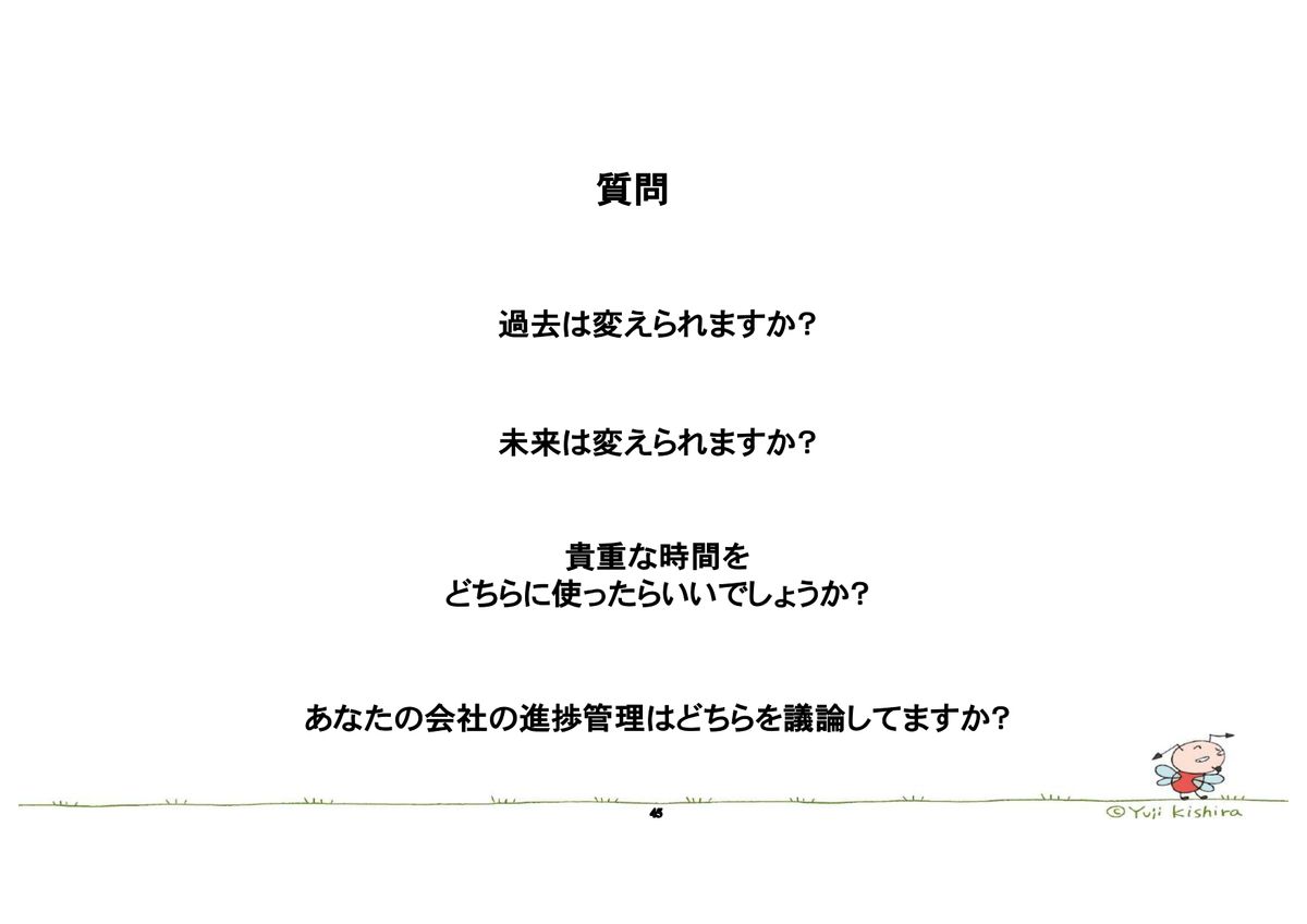 過去は変えられますか? 未来は変えられますか? みなさんの貴重な時間をどっちに使えばいいのか。プロジェクトメンバーにどのくらい(仕事が)済んだかって進捗管理をする人いませんか? みんな過去をしゃべっているんですよ。