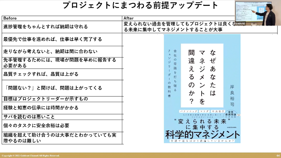 岸良:進捗管理をちゃんとすれば納期を守れるっていうのは間違いで、「変えられない過去」を管理してもプロジェクトは良くならない。「変えられる未来」に集中してマネジメントすることが大事。