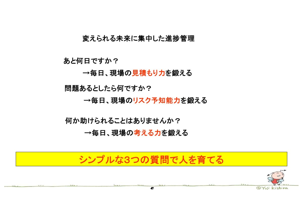 過去だから時間がかかるんだけど、変えられる未来に集中するんだったら、たった3つの質問でいいんです)。「あと何日ですか?」と。この質問をすると現場の見積もり力が鍛えられて、(その次は)「問題があるとしたら何?」って聞くんです。