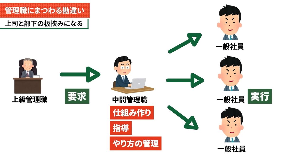 まず管理職に対する勘違いをしている人がけっこう多くて、2つの勘違いをちょっと説明したいと思うんですけども。勘違い1として「上司と部下との板挟みになる」みたいなイメージを持っている人もいると思うんですけども、これは完全に中間管理職の役割を勘違いしてる状態です。