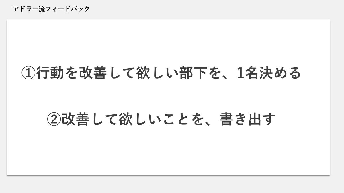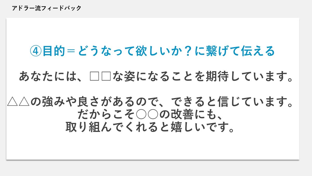 メンバーが今できていないところ、ダメなところとか、直してほしいところの原因を追及するのではなく、メンバーにそもそもどうなってほしいのか、どういうふうに成長してほしいのかから発想するのが、これまでご紹介をしてきた目的論の考え方です。それで、ここからどうフィードバックに落としていくかと言いますと……。