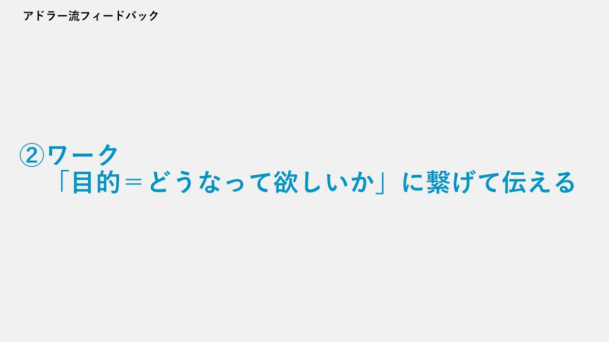 そして2つ目ですね。これはワークで考えてみたいなと思います。これも目的論の考え方になるんですが、「相手にどうなってほしいか?」につなげて伝えるというフィードバックの方法になります。