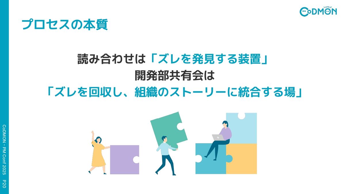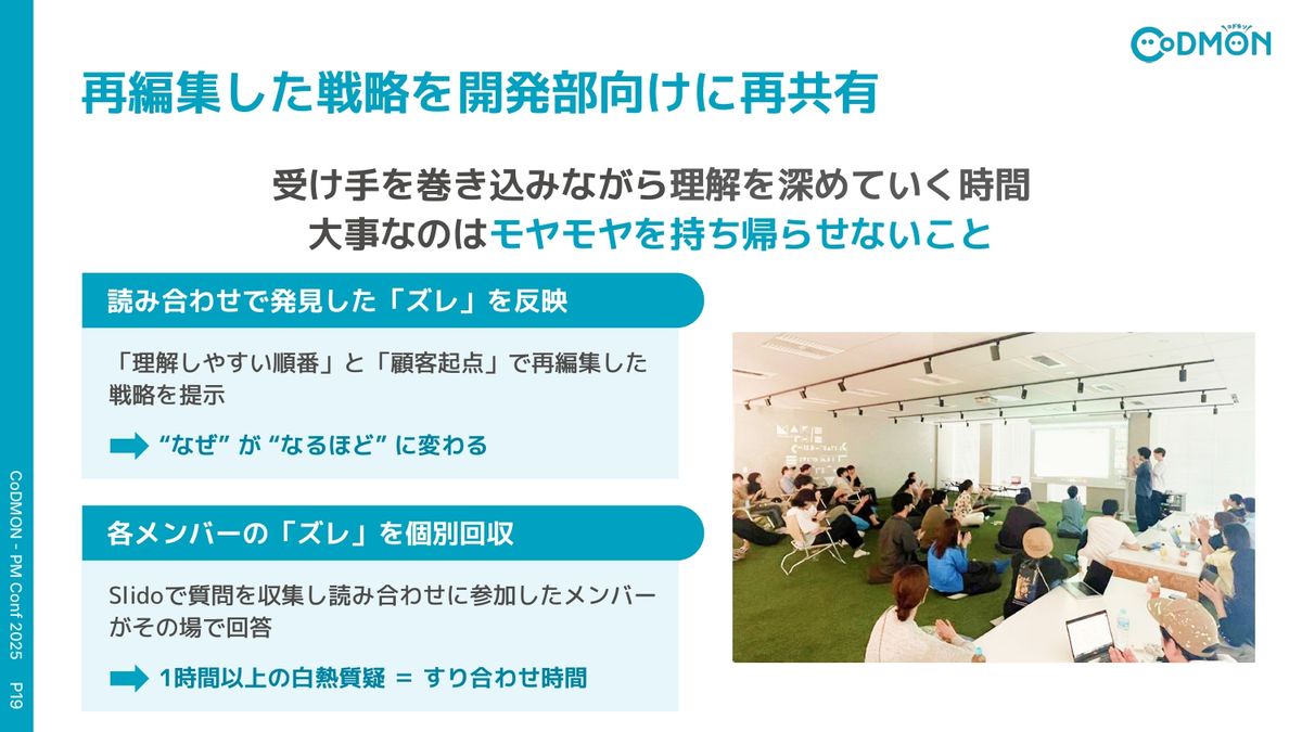 ここで再編集した内容を、開発部全体に共有会と質問会として実施しました。ここでのポイントは2つで、1つ目は先ほど読み合わせで気づいたズレを反映すること。2つ目は、その場で出たズレにも、一つひとつ向き合うということです。