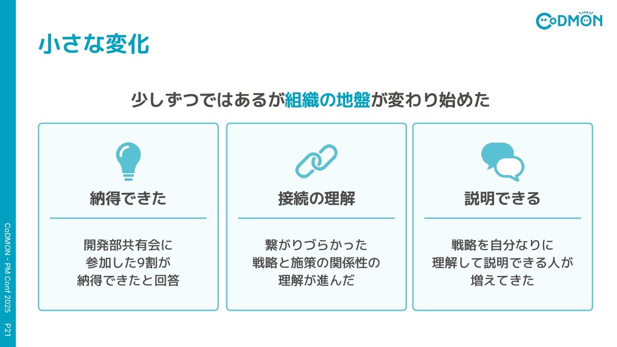 その結果、少しずつではあるんですけど、組織の地盤に変化が出てきました。まず、開発部の共有会に参加した9割のメンバーが、「納得できた」と回答してくれました。また、戦略とか施策の関係性を自分の言葉で説明しようとしてくれる人、説明できる人が増えてきました。