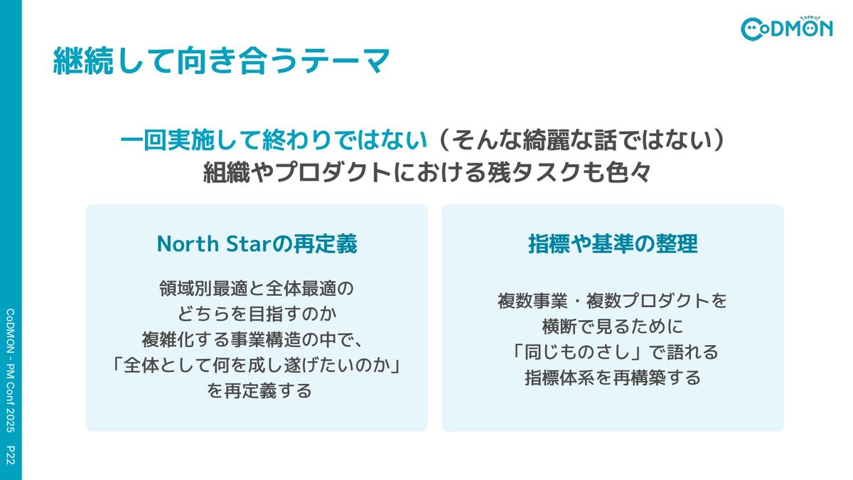 今、継続して向き合っていくテーマとしては、1つ目は「North Starの再定義」です。前半にもあったように、コドモンって複数の領域を抱えているので、構造的にどうしても個別最適と全体最適がぶつかりやすい状況にあります。なので、最適な方向を維持しながら、全体として同じ方向を見るために、北極星をどう設計していくかというのは、引き続き議論が必要かなと思っています。