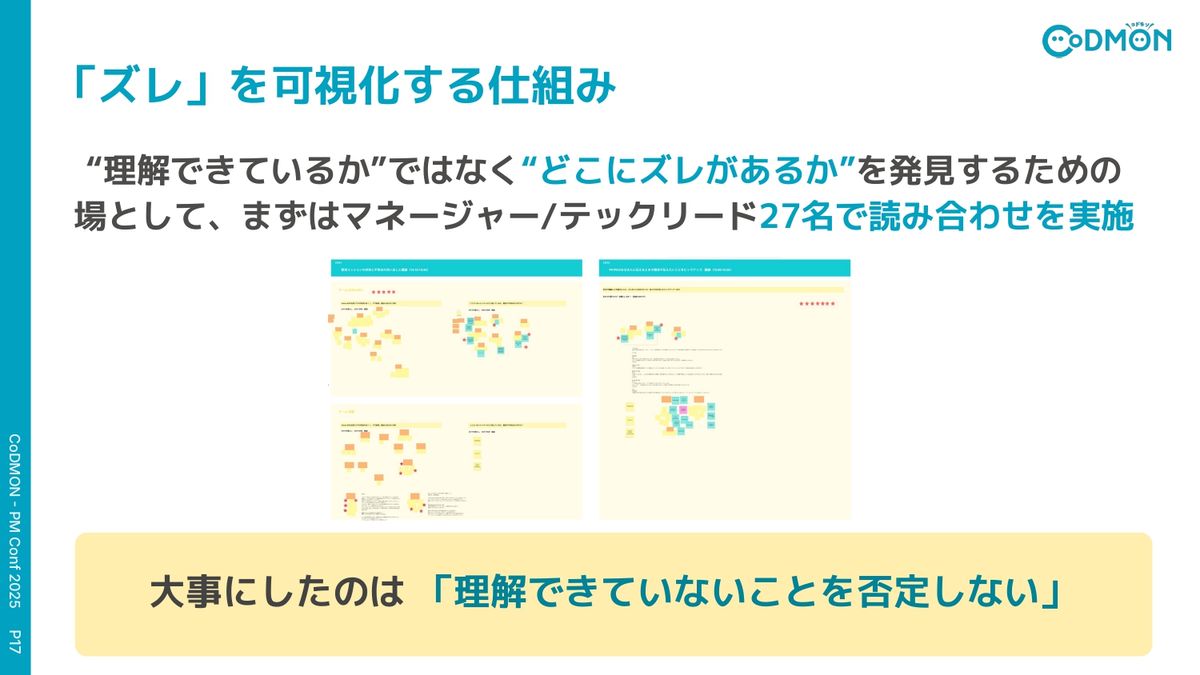 重山由香梨氏:後半に入っていきます。まず私たちがやったのは、「理解できているか」ではなくて、「どこにズレがあるか」というのを発見する場を作りました。対象はマネージャーとテックリードを27名集めたんですけれども、戦略資料を一緒に読み合わせしながら、疑問とか違和感とか解釈の差を、すべてMiro上にばーっと洗い出していきました。