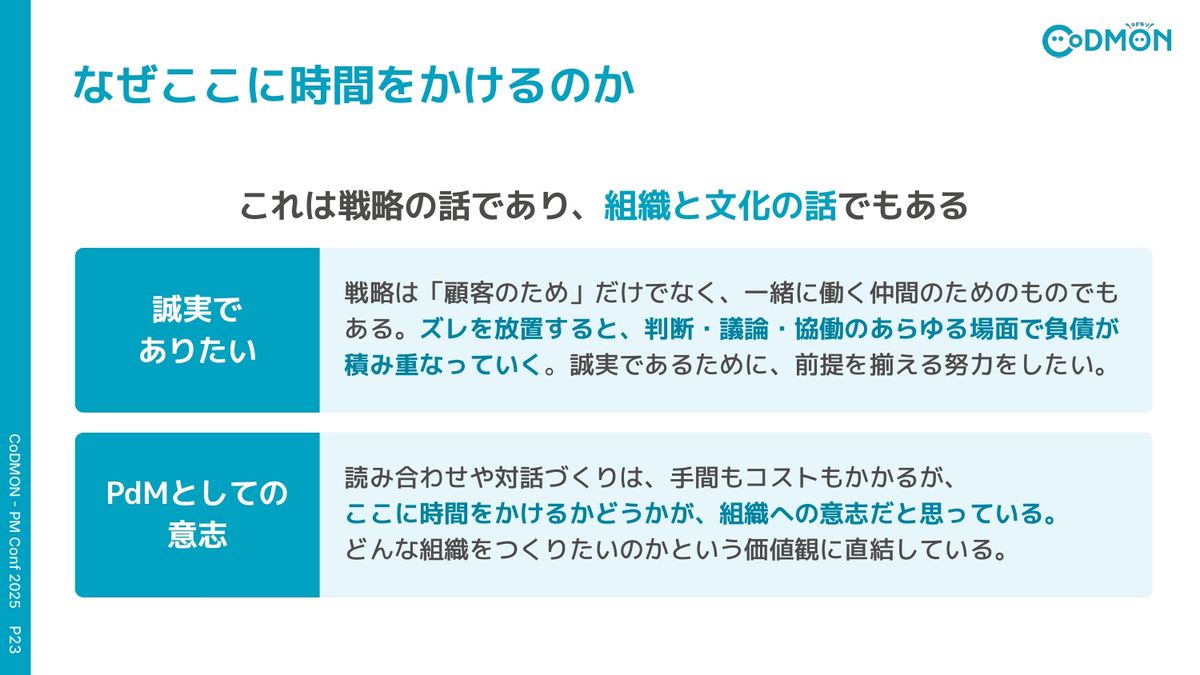 戦略ってもちろん顧客のためではあるんですけれども、同時に一緒に働いてくれている仲間のためでもあると思います。ズレを放置するということは、さまざまな場面で負債を積み重ねていくことと一緒だと思っています。なので、誠実であるために、やはり前提をそろえる努力は続けたいなと思っています。