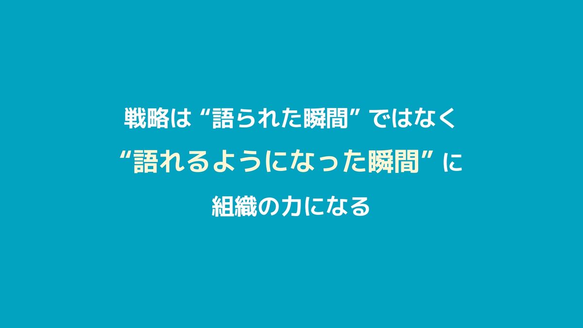 「戦略は『語られた瞬間』ではなく、メンバー一人ひとりが自分の言葉で『語れるようになった瞬間』に、組織の力になる」。最後のスライドはめっちゃカッコつけちゃって恥ずかしいんですけど(笑)。やっていることは本当に簡単でシンプルだと思うので、すぐにでも採り入れやすいかなと思います。今日の話がみなさんの組織で、その一歩を作るヒントになればうれしく思います。
