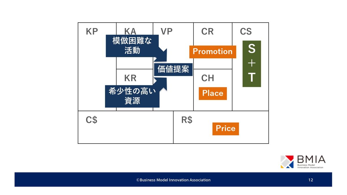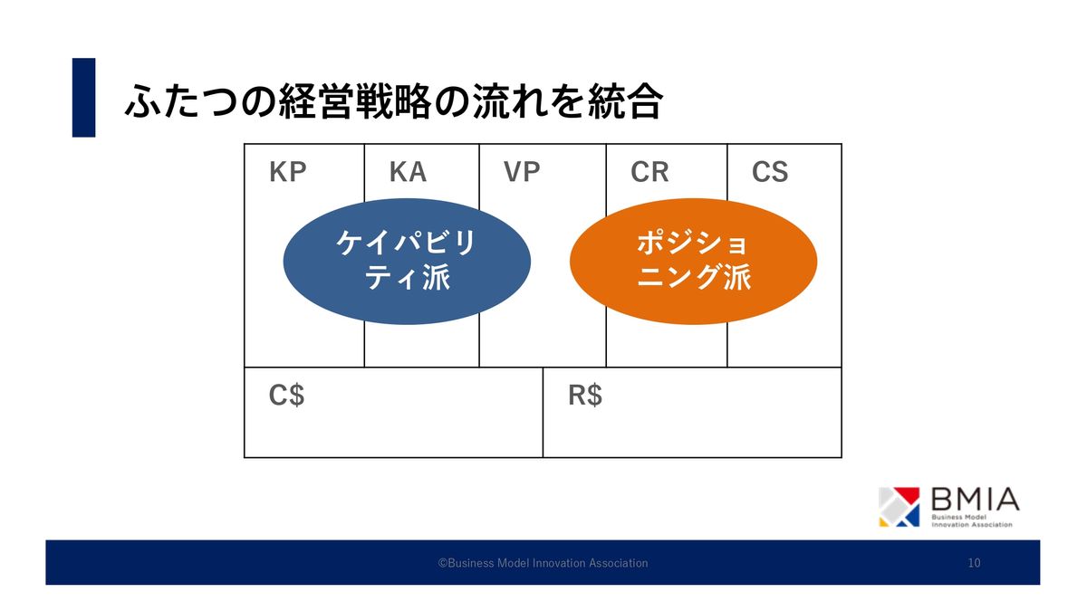 小山:このビジネスモデルのこうしたつながりの背景には、実はポジショニング派、ケイパビリティ派という経営戦略の2つの流れがあります。ポジショニング派はSTP、4P(マーケティングミックス)。こういったものによってまず、ビジネスモデルの右側にあるポジショニングのストーリーが確定します。