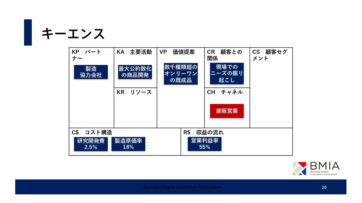 メーカーというと普通は利益率10パーセントで及第点です。大きなところになると、もう3パーセント、4パーセントでギリギリ利益を出しているようなところがある中で、50パーセントという驚くべき利益を出した。私がビジネスモデルのワークをやる時に、こういう数字を入れて、この数字がなぜ出てくるのかという、上のビジネスモデルを逆に推測するなんていうワークをやったりもします。