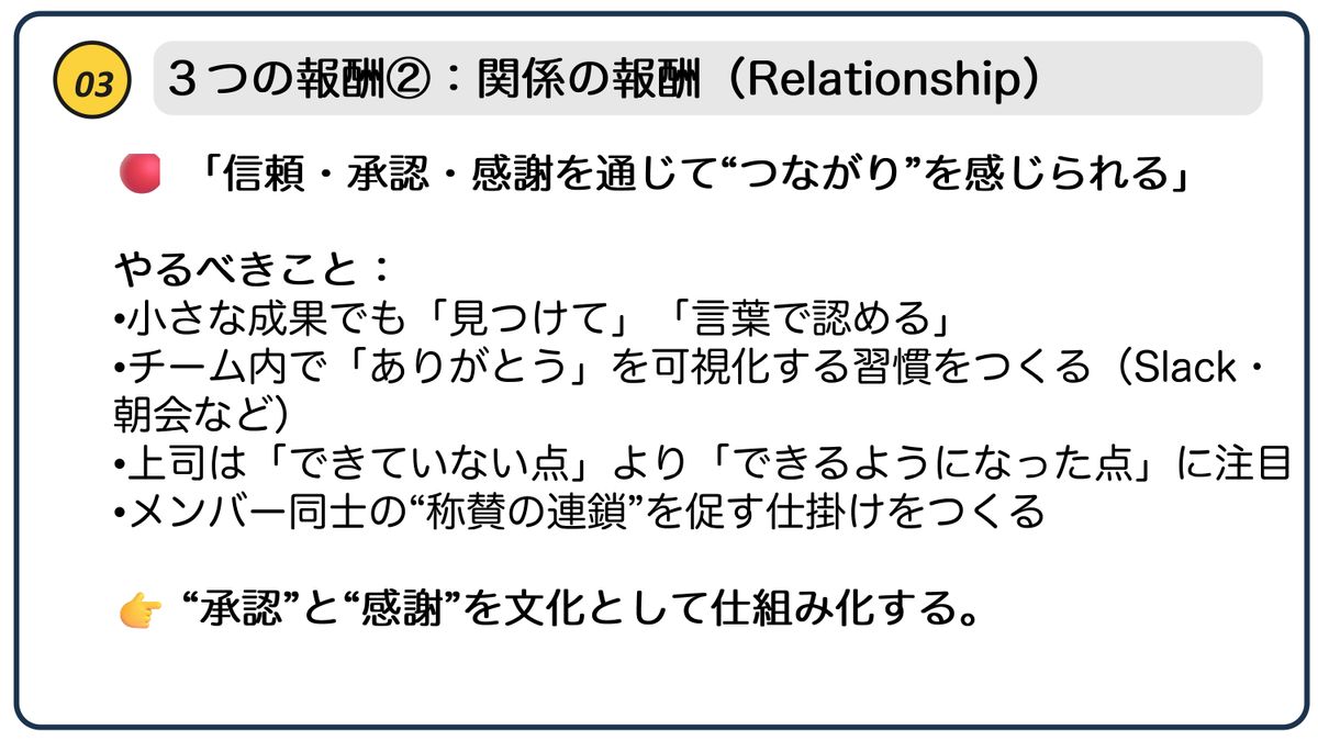 永島:3つの報酬ですね。これは甘やかしてるわけじゃないんですよ。先に渡して動いて(もらって)。これは関係性のことです。先ほど言った「架け橋をかける」っていうのは、意味の報酬、関係の報酬、成長の報酬を渡していく・約束していくということです。