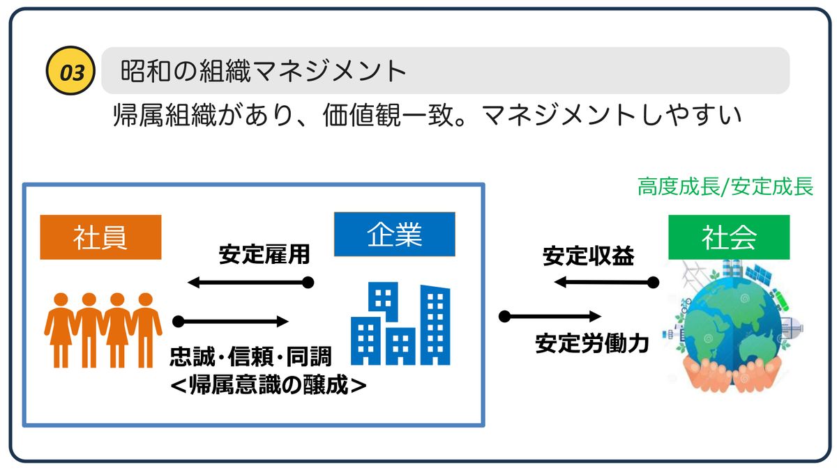 昭和の組織っていうのは、帰属意識がやはりあるんですよね。なぜかというと、社会が発展していくから、意味づけしなくても、自分の仕事で成長実感が得られるんですよ。だから安定雇用で箱の中に入る。