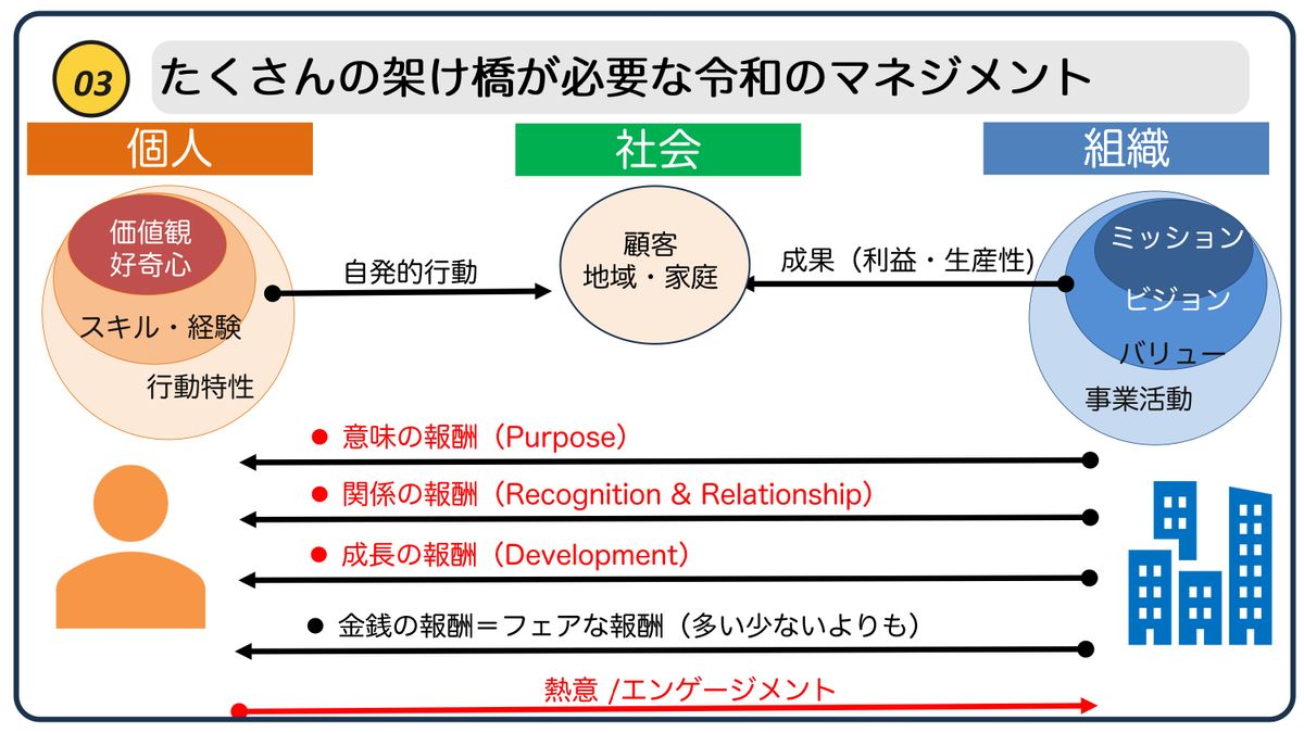 永島:(スライドを示して)関係の報酬というのは、この関係性ですよね。よく言われるんですけど、同僚との関係性、上司との関係性、顧客との関係性、いろいろなものがあるんですけど。違う価値観をつないでいくので、「どういう関係性を作るか?」をぜひ今日ご覧になっている方は……。