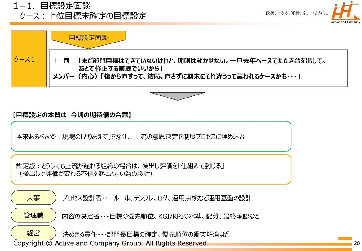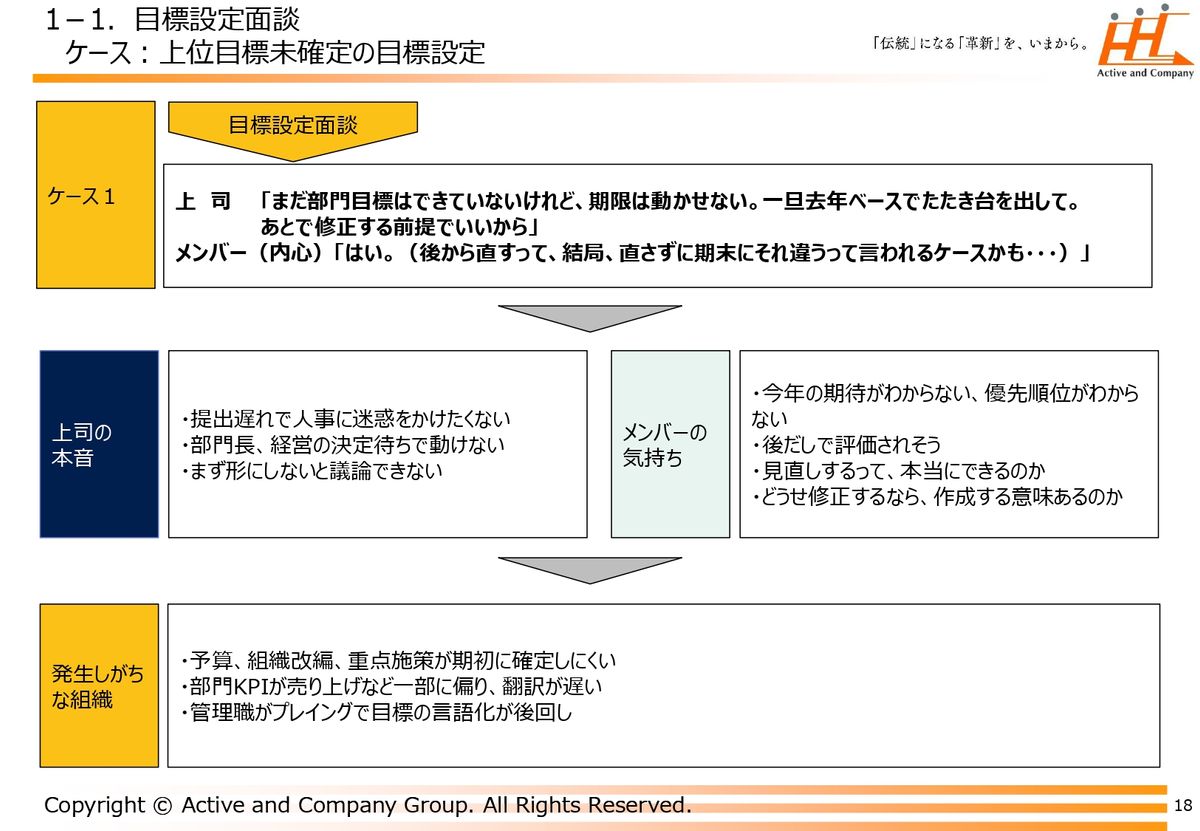 さっそくケース1に入っていきたいと思います。目標設定面談です。目標を設定していただくことが最初のスタートになるんですが、この時に、まだ部門目標が決定していないんだけれども、期限は動かせないので、「去年のベースを叩き台にして目標を作ってよ。あとで修正する前提でいいから」というようなかたちで上司の方がメンバーに言われるケースを、実際に私も見聞きしております。