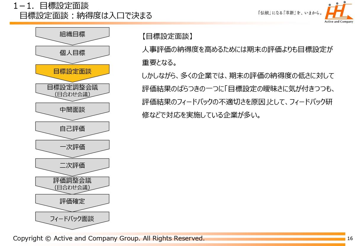 では実際に「目標設定面談」から、お話をしていきたいと思います。人事評価の納得度を高めるためには、期末の評価よりも目標設定が重要となってきます。