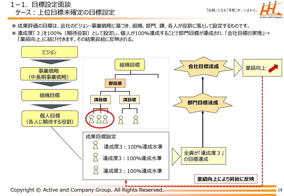 その目標を設定して、達成度3を期待役割の100パーセントだと仮定した時には、個人目標がすべて100パーセント、達成度3になることで、部門の目標が達成されて、それで会社の目標が達成される。それが業績向上に結びついて、その結果、昇給に反映されるというかたちなわけですよね。