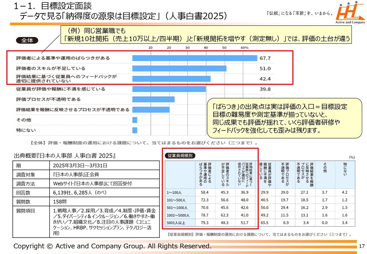 (スライドを示して)こちらは評価・報酬制度の運用における課題について、約6,000社の方が回答しているアンケート結果になります。ここでも見てわかるように「評価者による基準や運用のバラつきがある」というところが67.7パーセントで、(多くの企業が)課題感としてお持ちですけれども、このバラつきの出発点って、実は評価の入り口の目標設定とも言えると思っています。