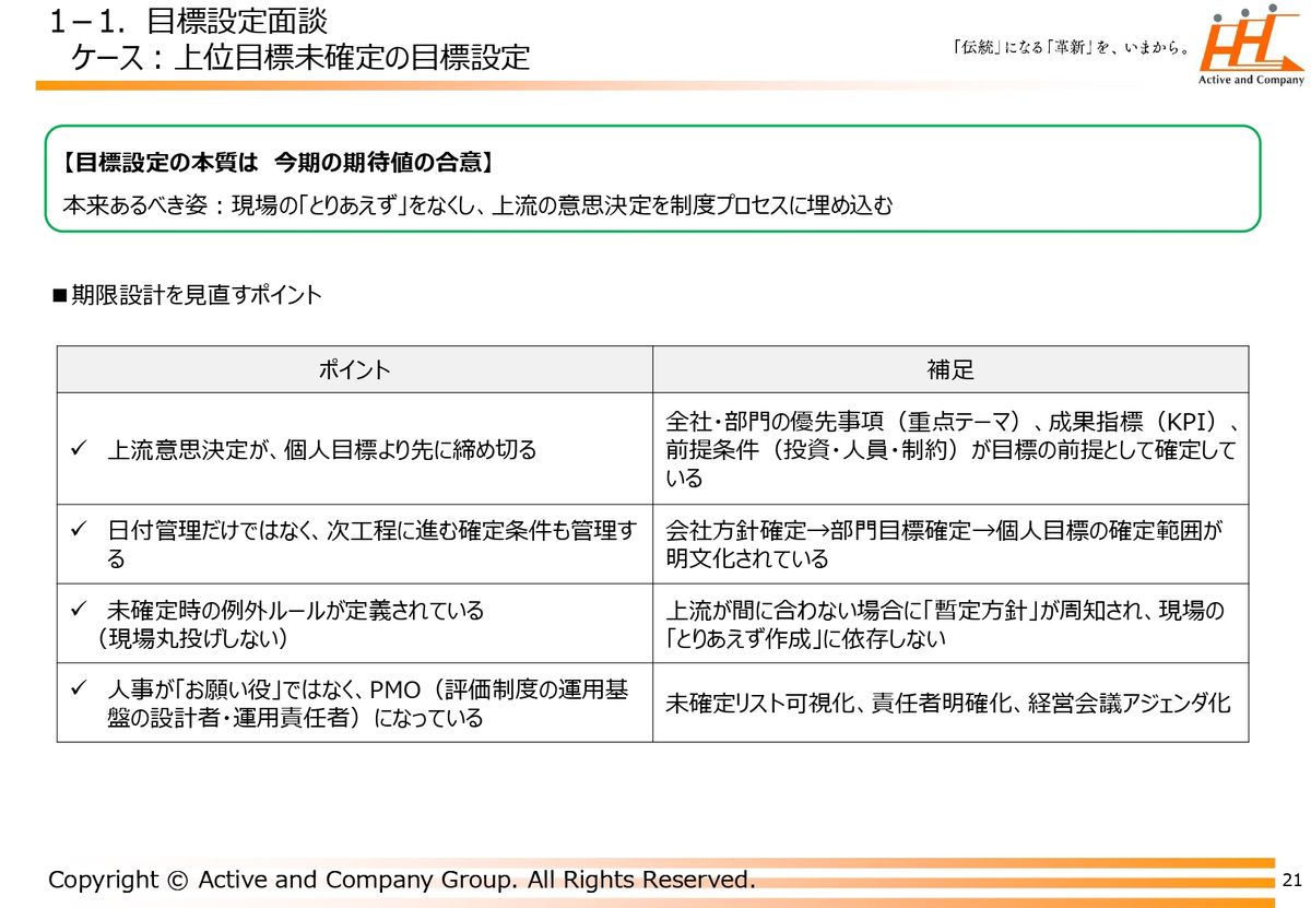 ここは例にも挙げましたが、「新規10社開拓」というところで、「売上10万円以上/四半期」としているのとか、新規開拓を増やす「測定無し」では、そもそも評価の土台が違うといったようなところを、細かに見ていただく必要があるのではないかなと思っております。