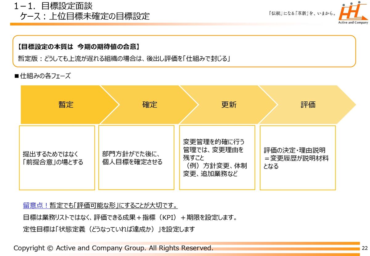 ここで「何が問題点か?」というと、暫定で立てたものを暫定のままで走らせることが問題なわけですよね。目標設定の本質はもちろん「今年の期待値の合意」ではあるんですけれども、もし仮に暫定で出すんだとするならば、目標としては「今期の期待値の合意」が未成立な状態で走らせることはできないわけですね。それをしてしまうと、期末に説明不能な状態になって、評価不振に直結してしまう。