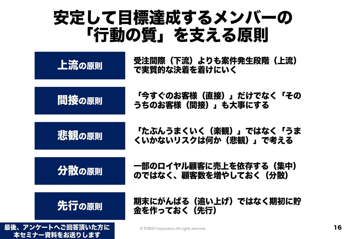 そして、先行の原則。期末にがんばるのではなく、期初に貯金を作っておくということです。こういうことができている人は、やっぱり安定して達成することになります。