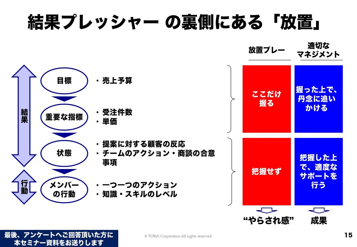 これ、一見すると、とってもきれいで、メンバーに対してやりやすさを強調するマネージャーのように思えるんですけど。「結果を見てます」って時に「結果以外は見ません」だと、これは放置プレーじゃないですか、ということです。