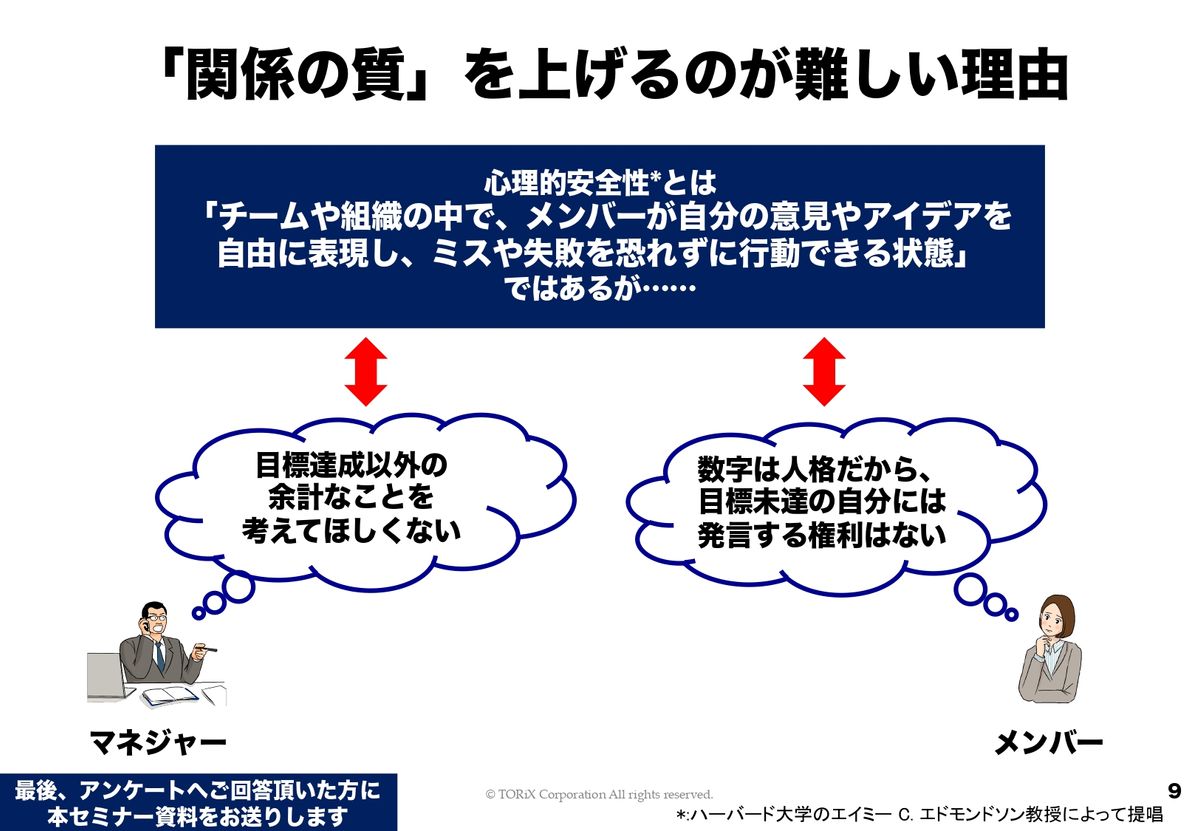 ただし、この関係の質が上げにくいのは、心理的安全性っていう言葉があって、これはチームや組織の中でメンバーが自分の意見とか行動を自由に表現して、ミスや失敗を恐れずに行動できる状態ではあるんですけど。