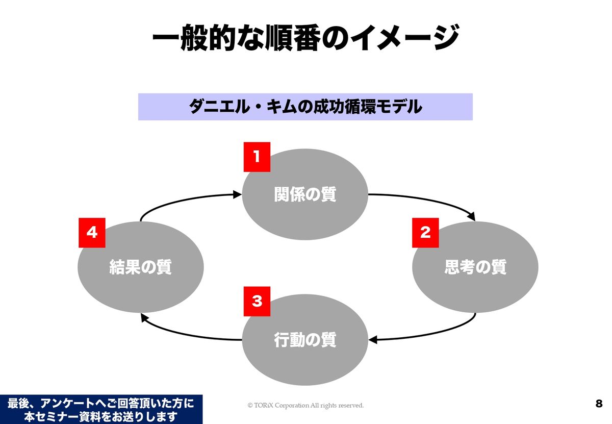 これ、やろうと思っても、結果の質、短期目線のプレッシャーがかかった瞬間に、ものすごく引っ張られやすいということです。一般的な順番のイメージっていうのは、このダニエル・キムの成功循環モデルで、(スライドを示して)この位置で図解されていることが多いんですね。一番上に関係の質がきています。ということは、だいたい多くの方が、1・2・3・4って感じで考えがちなんじゃないでしょうか。