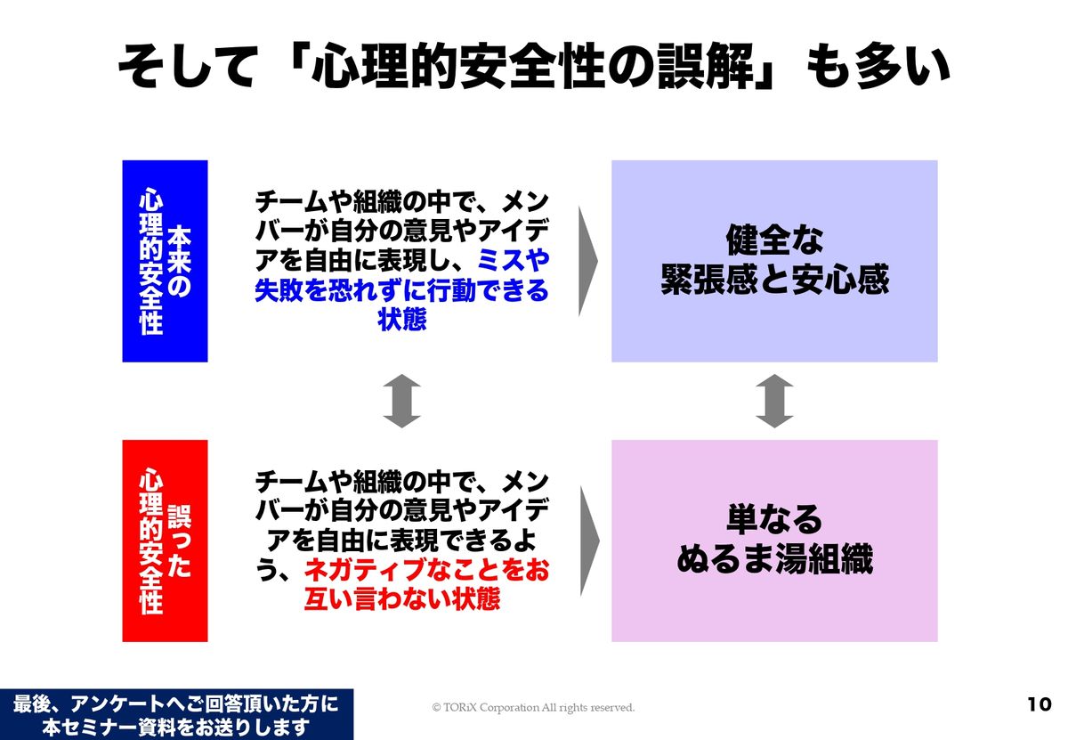 ただし、世の中で多くの捉えられ方というのは「心理的安全性を大事にしなくちゃいけないから、こういうことは言っちゃいけないんだ」みたいな。こっち側で捉えられている方のほうが圧倒的に多いというのが、日々いろんな組織に関わっている自分の実感でございます。