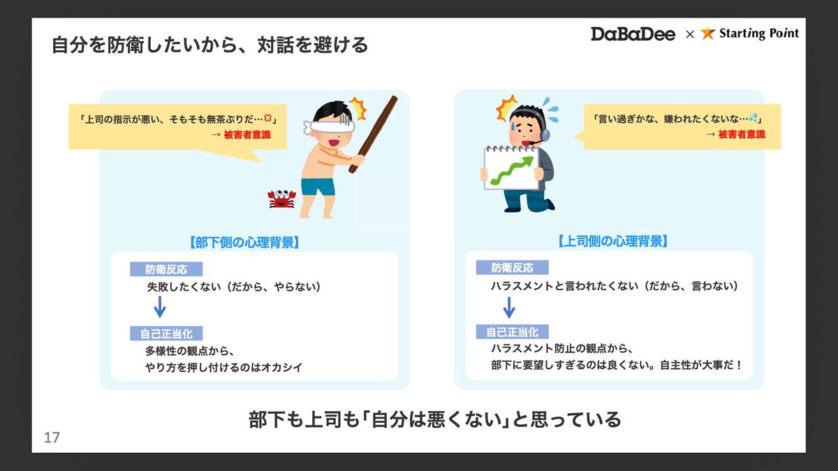 その結果、「ハラスメント」や「多様性」という観点から、「あまり部下に要望するのは良くない」と自分に言い聞かせたり、「部下の自律性が大事だよね」と語ったりする管理職が多くなります。上司も部下も、実はどちらも自分を防衛している。だから一線を越えないし、対話を避ける構造が生まれているわけです。