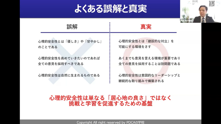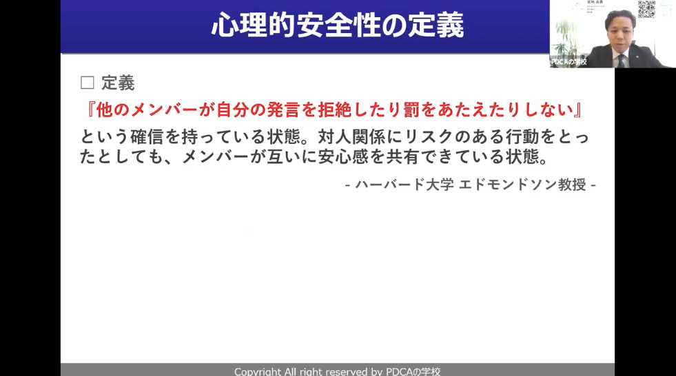 言ってくれたことや、発言をしてくれたという行動に対しては認める。ただ、発言の内容やアイデアの内容とかはじっくりと吟味していきましょう。これが(心理的安全性の)本来のあるべき姿です。そこは誤解しないように、上司の方や管理職の方々は携わり方を間違えないようにしていただきたいなと思っております。