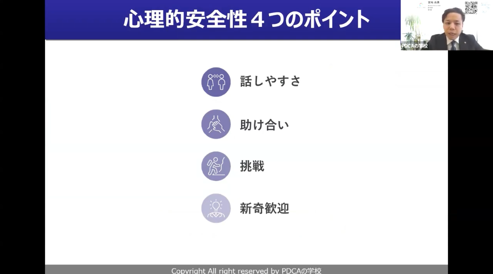 ただ、(本当の意味での心理的安全性とは)そうではないです。いわゆる相談できる環境づくりなので、何か意見があったら発言できるとか、すごくいい意見を持っているのに「何も言うな!」みたいな状態が良くないですよということです。なので、意見を言ってくれたことに対しては認めましょう。