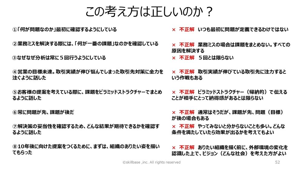 ただ、いろんな相談が来るから、やはり一般的なやり方だとうまくいかないこともある。例えばこんなことが起きます。「問題解決はこうなんだ」と。「この考え方は正しいですか?」と8つ挙げています。