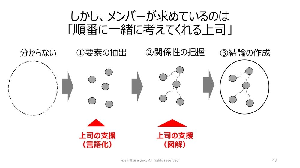 つまり、要素を抽出する。今、何が起きているか一緒に言語化をして、関係性の把握、「今、こういうことが起きているんだよね」。そこに対して上司が支援をしてくれる。言語化して図解を一緒にしてくれる上司を求めています。ここをまず理解しないといけないです。