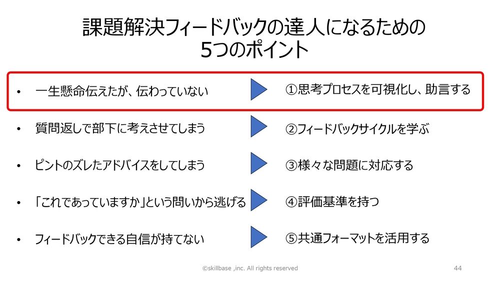 というわけで、フィードバックってやはり難しいんです。こんなふうに失敗してしまう。だから、それを乗り越えなきゃいけないです。我々は、「課題解決フィードバックの達人」になるためには5つのポイントがあると思っています。
