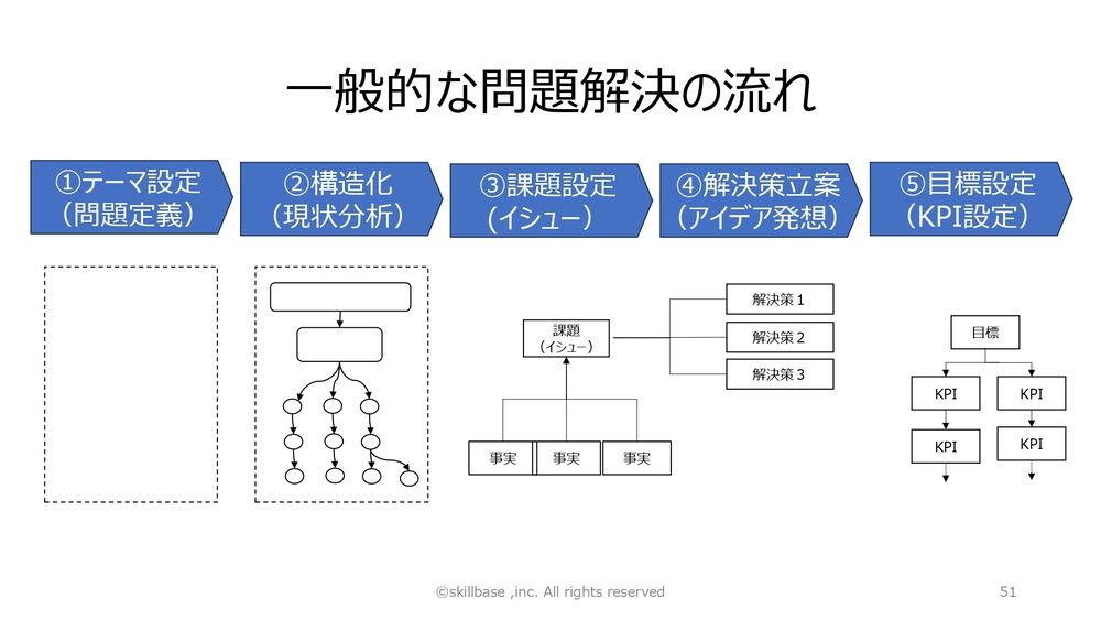 (スライドを示して)一般的な問題解決の流れというのはこうです。テーマを設定して問題を定義して、構造化して現状分析して、なぜなぜ分析、そして課題設定、イシューは何かと。そして解決策立案、アイデア発想をして、目標設定、KPI(Key Performance Indicator)を設定する。こんな感じかなと思います。