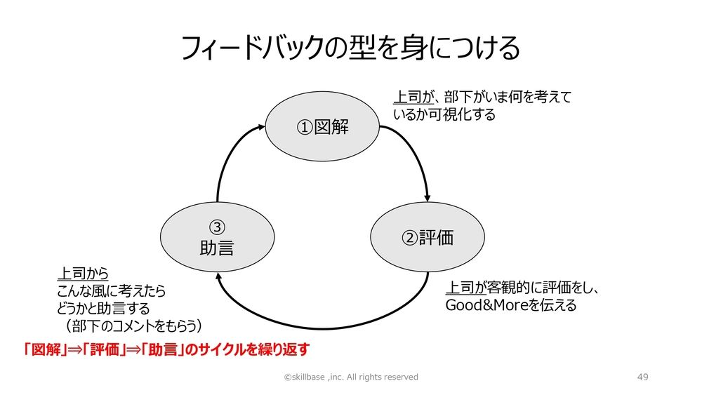 (スライドを示して)1番、図解。上司は、部下が今何を考えているか可視化する。「なんとかさん、今、こんなふうに考えているよね」と図解してください。次に評価。上司が客観的に評価し、Good&More、「ここはいいね。そしてここをもうちょっとしたら良くなるんじゃないかな」と。そして助言。上司から「こんなふうに考えたらどうか?」と助言して、部下からのコメントをもらう。図解、評価、助言のフィードバックサイクルを繰り返します。