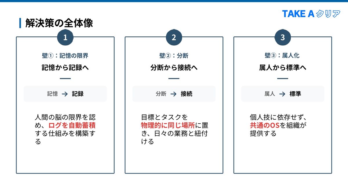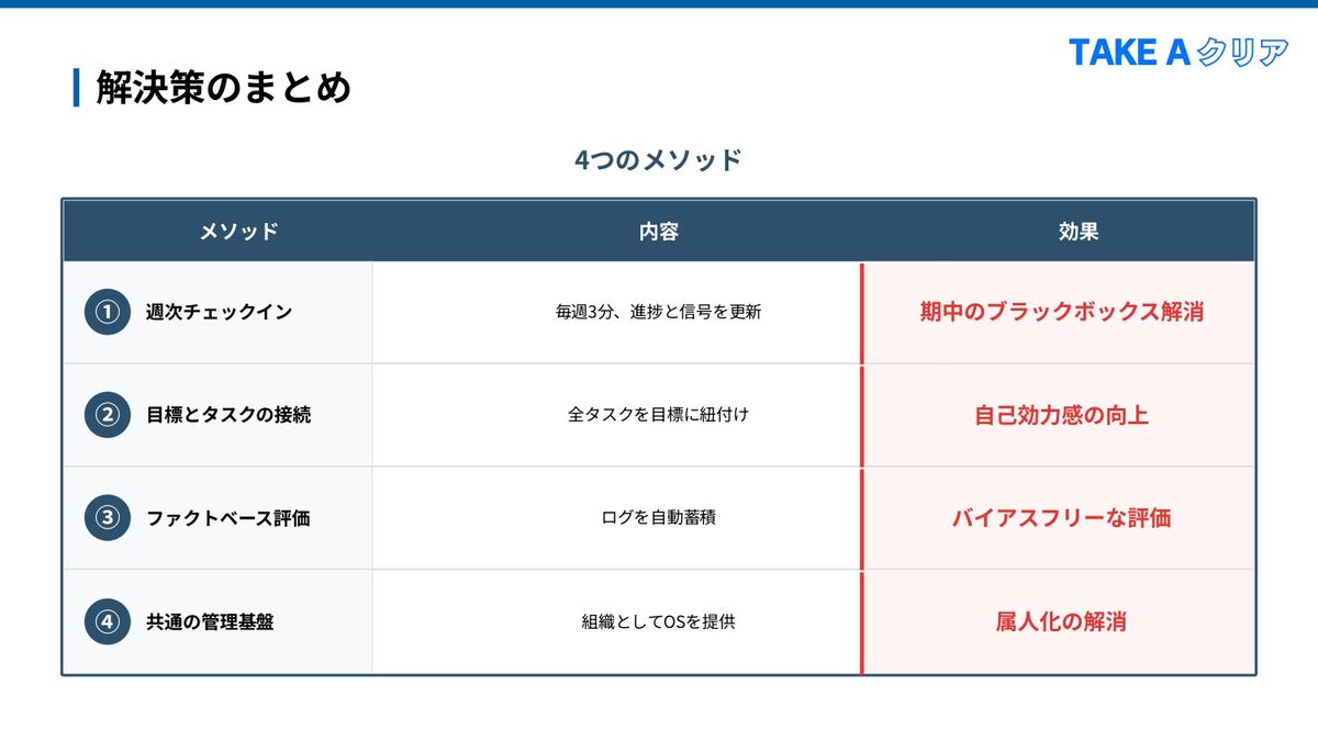 (スライドを示して)あらためて今回の解決策のまとめとしましては、週次や、こまめに更新する仕組みを会社として、しっかりと整えていくところがまず1点。2点目は、物理的にもしっかりと目標とタスクをひもづけていきましょう、という観点。