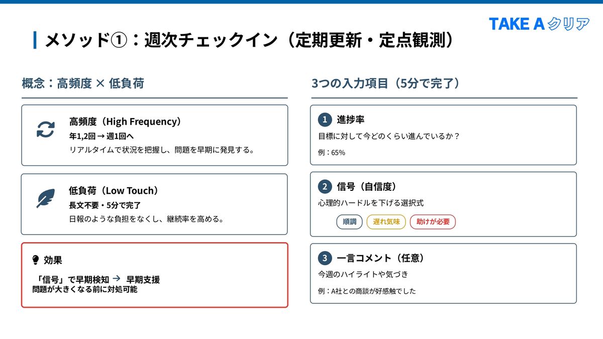 概念としては高頻度・低負荷でしっかりと回していこうということで、管理職の方に依存するのではなく、会社の共通のイベントとして必ずやっていこうというところが、このチェックインという概念、週次の管理になってきます。
