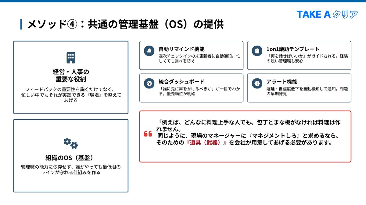 なので例えば部門長だったり部長の方に関しては、自分自身のマネージャー、リーダー層の方に、まずは管理のところで「フィードバックが重要だよね」「こういうのをやろうよ」と言うだけではなくて、そもそもの環境を整えてあげるところまでご支援していただけるだけでも、標準化にバラつきがなくなってくる部分ではあるので、ぜひそこの観点も意識していただければなと思っております。