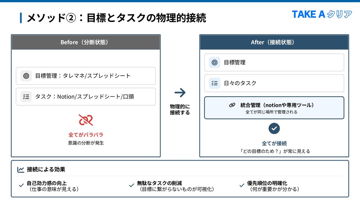 必然的に目標とタスクがひもづいて、ちゃんと意識して見ていくケースがどんどん減ってしまうと思うので、まずは物理的にしっかりと目標とタスク、日々の行動・アクションを接続するところが非常に重要になります。