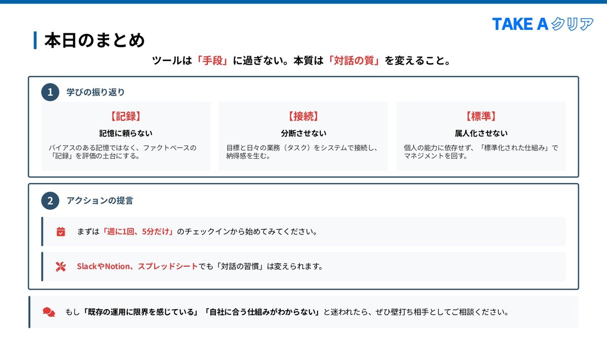 (スライドを示して)だからこそ、この3つの観点ですね。あらためて最後にまとめさせていただきますが、記録と接続と標準というところ。本日はみなさんに、この3つの観点をあらためて社内に持ち帰っていただいて、自分たちの組織・会社の制度・仕組みで、これらがちゃんと整えられているかどうかをぜひ見直してみてください。