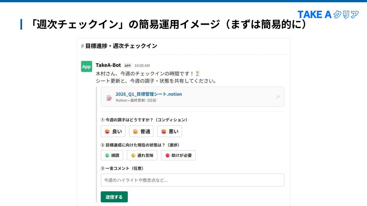 この際、今の基盤の目標管理のシートなどはわざわざ変えないで、あくまでもそこのリンクは今の管理ツールを使いつつ。プラスアルファで、フォーマット自体をSlackとか簡易的に更新できるような仕組みに整えるだけでも、しっかりと会社で共通のタイミングでみんなが更新する、目標を意識して管理していくことができるようになってくるかなと思います。