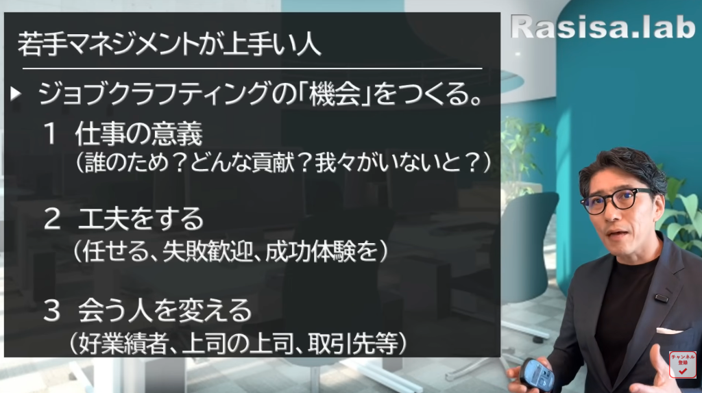 若手マネジメントが上手な人は、「この上司の下であれば成長できるし、この上司の下であればもうちょっと一緒に仕事をしてみたいかな」と思われる。これがポイントなんですね。なので、ジョブクラフティングについてはぜひ覚えておいてください。