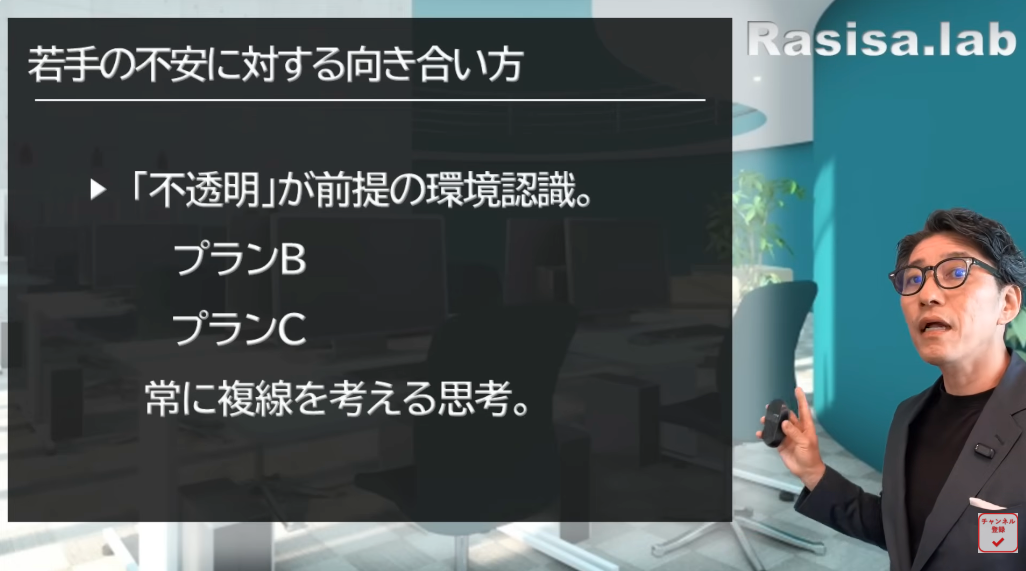 若手の不安に対する向き合い方は(スライドを示して)このように言われています。今は不透明な時代と言われますが、若手にとってみれば不透明がスタンダードなんですよね。